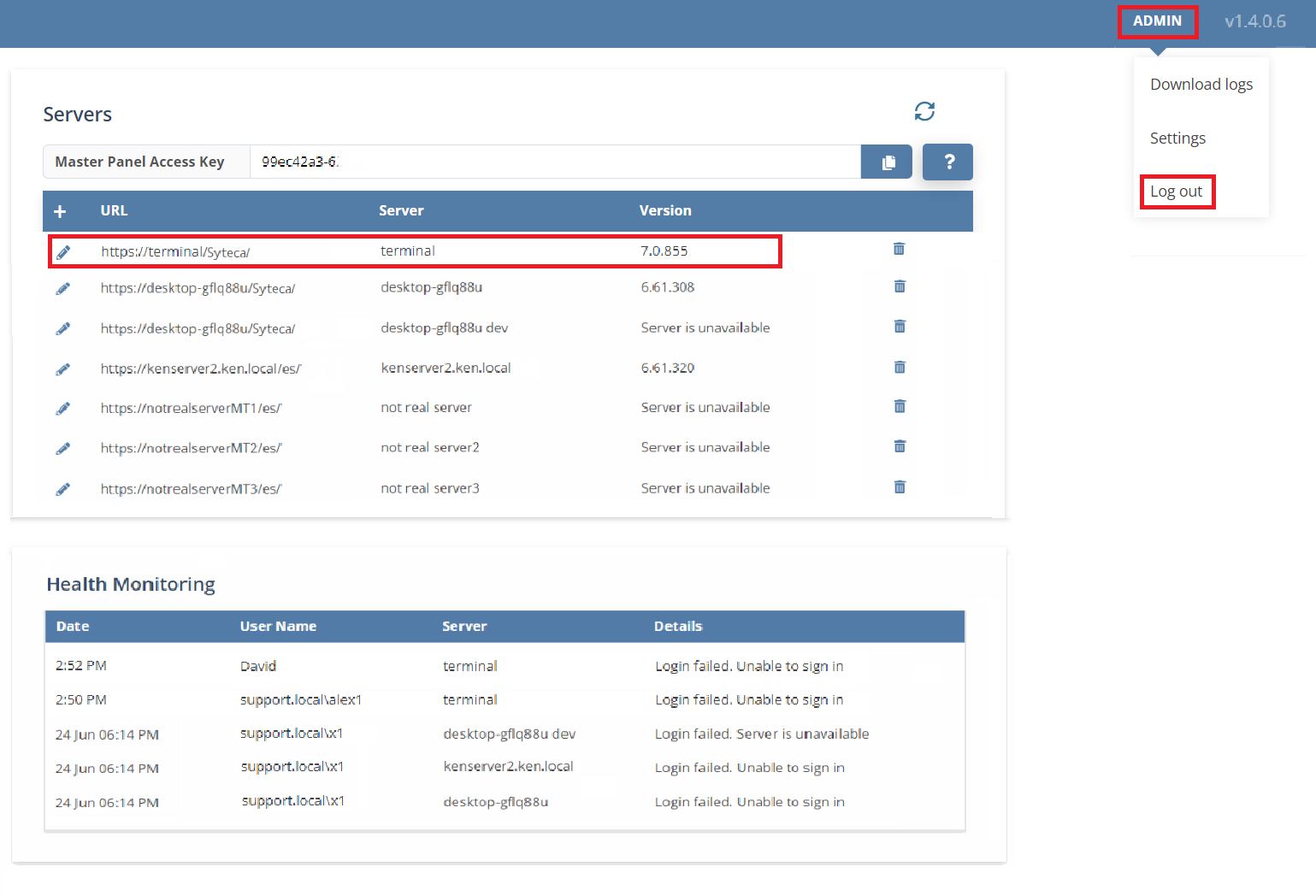 NOTE: In the drop-down menu, apart from logging out, you can also download the Master Panel logs, and change the settings (i.e. change the "admin" password, and configure SSO authentication).
