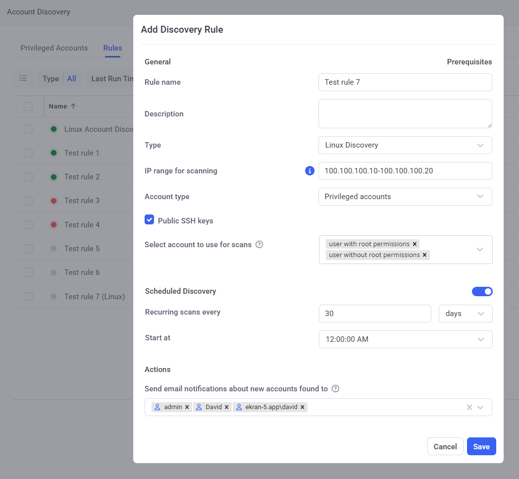 - Privileged Accounts: To scan the Linux computers in the IP range/list specified, and discover only privileged accounts (i.e. non-daemon accounts that were created manually, and the “root” account).
