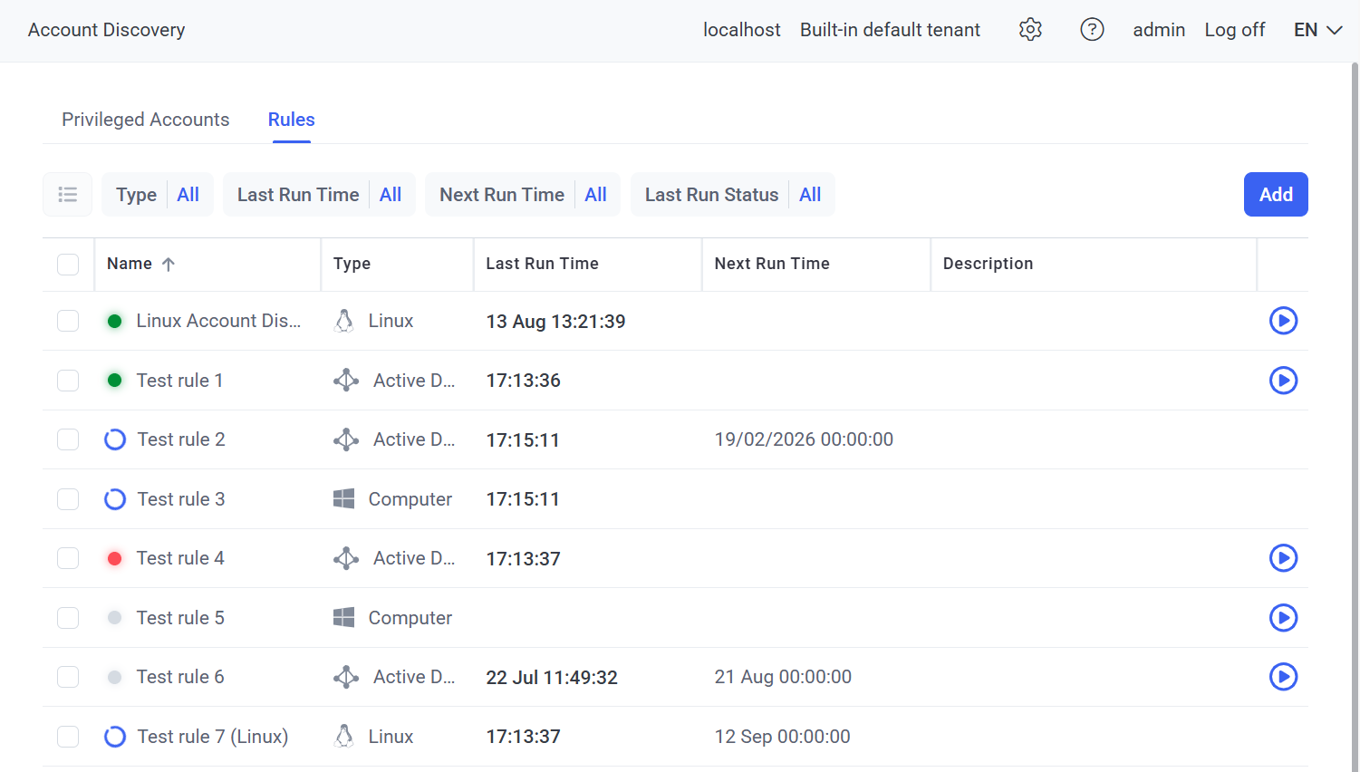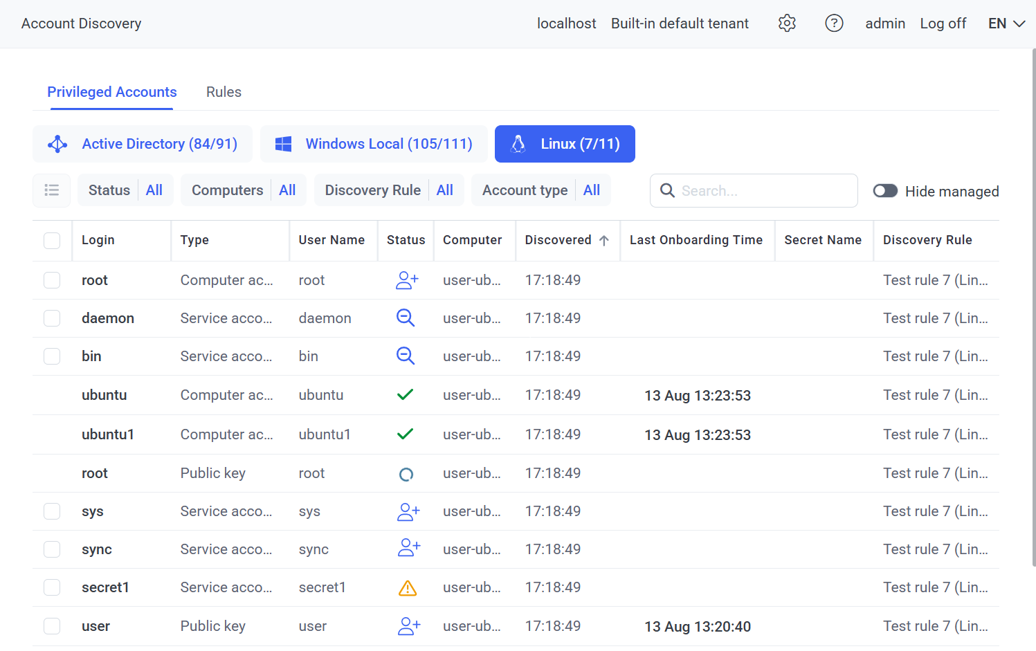 3. On the Account Discovery page on the Privileged Accounts tab that opens (on the Active Directory, Windows Local, and Linux sub-tabs), a list of accounts previously discovered by rules that have been run (i.e. Completed or Completed with errors) are displayed in the grid with the following columns:
