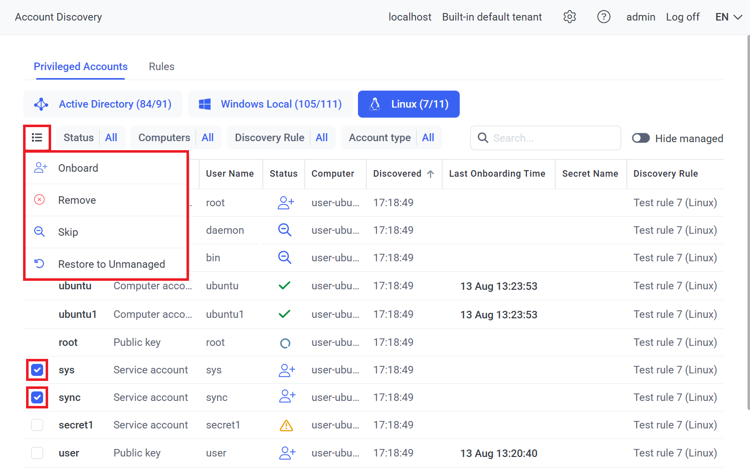 NOTE: Checkboxes are not displayed for accounts with the "Managed" (or "Onboarding in Progress") status, since they have already been (or are being) onboarded, and cannot therefore be removed, skipped or restored back to "Unmanaged" status (except by deleting the secret created on the Password Management page, in which case the account will be automatically restored back to "Unmanaged" status).