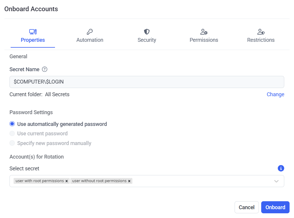 5. On the Automation, Security, Permissions, and Restrictions tabs, configure the settings in the usual way (as when editing or adding a secrets on the Password Management page).