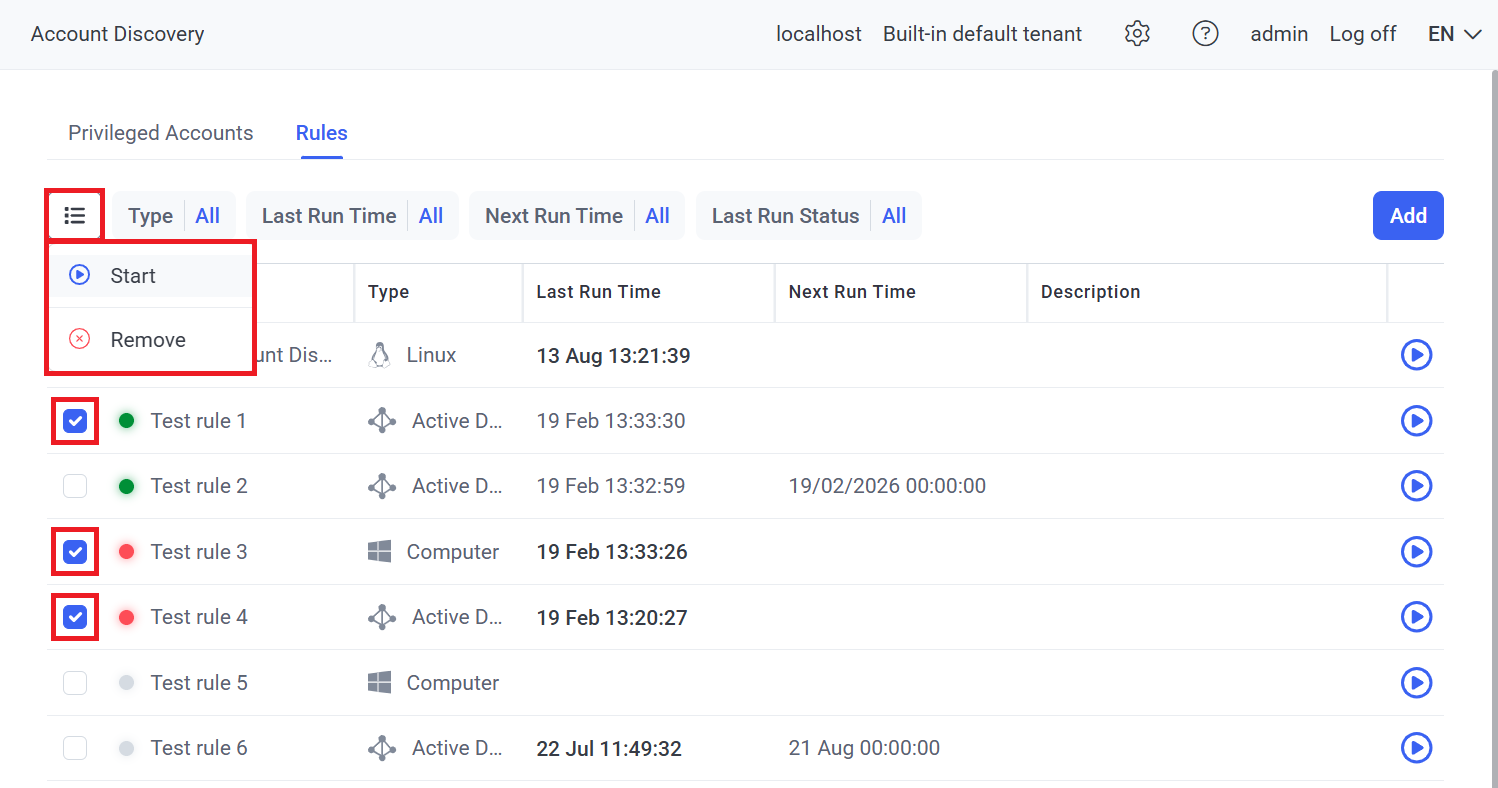 NOTE: If the same account was discovered by multiple rules, only one record (row) is added to the list in the grid, which is for the rule that was last run.