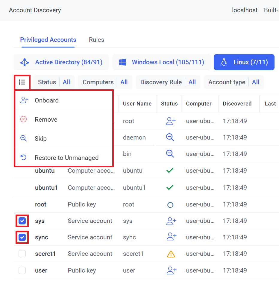 3. On the Account Discovery page that opens, on the Privileged Accounts tab (optionally use the filters e.g. the Status filter to select only Unmanaged accounts, and then) either: