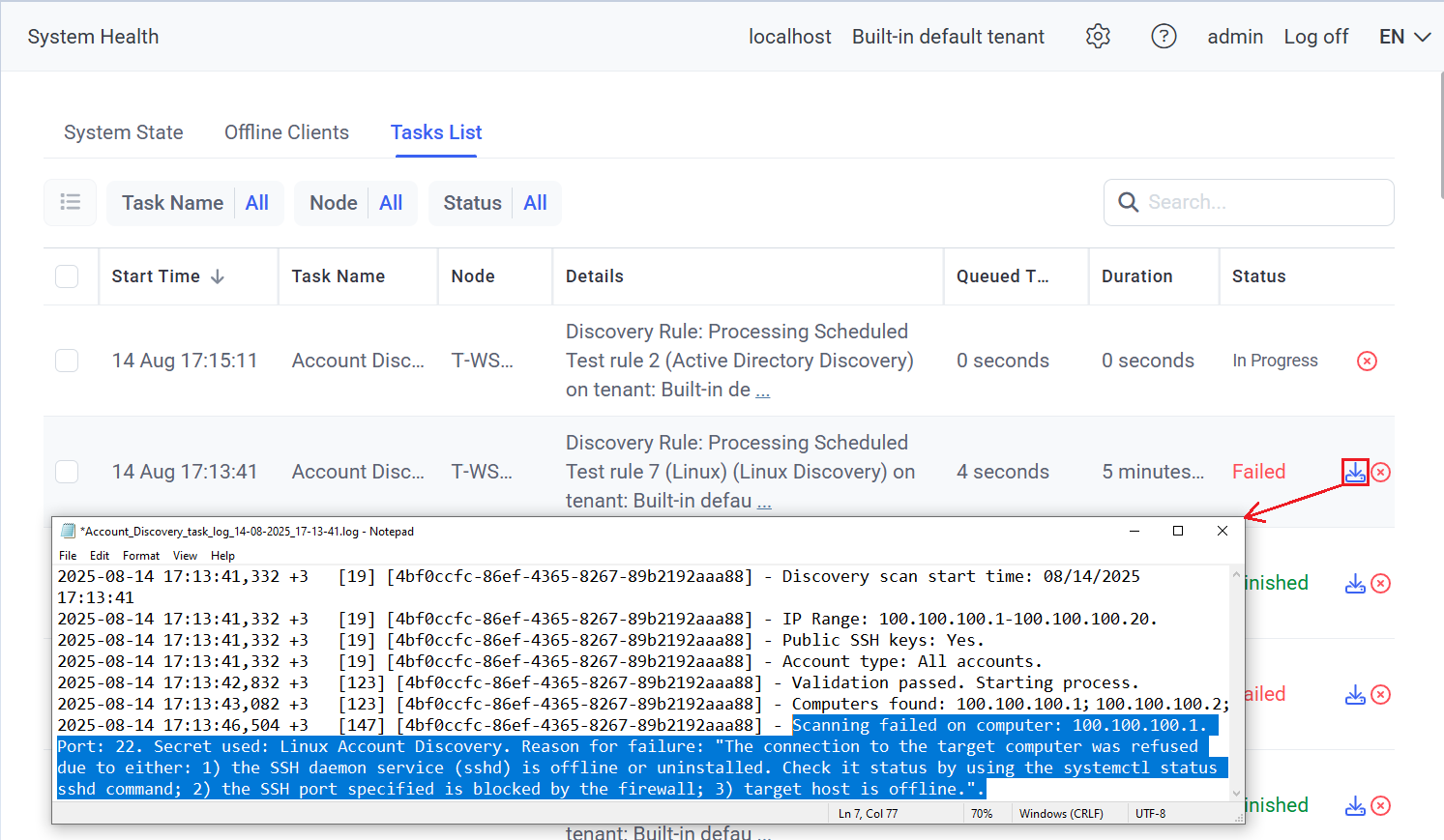 • The task’s log file can be downloaded (when its status is Finished or Failed) by clicking the Download logs (