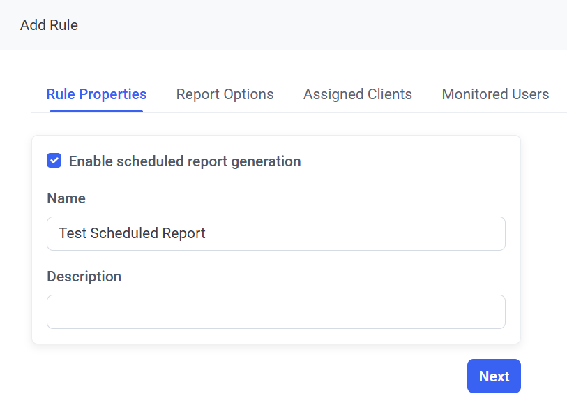 4. On the Add Rule page that opens, on the Rule Properties tab, enter a unique name for the new rule, optionally enter a description for the rule, and select the Enable scheduled report generation checkbox, and then click Next.