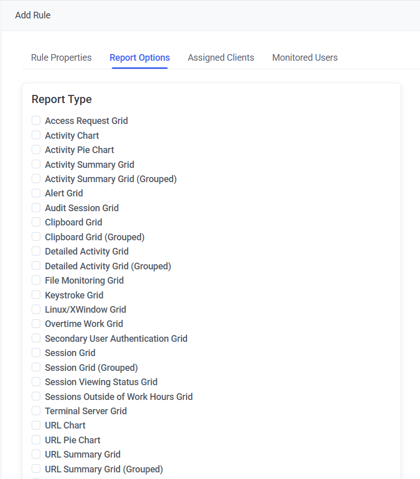 • In the Report Type section, select at least one of the checkboxes for the report types required.