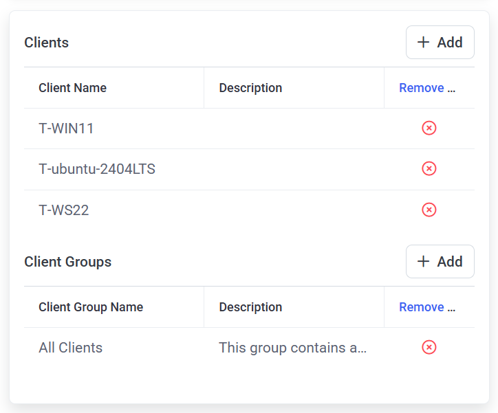 6. In the Clients and Client Groups sections, and select the Clients and/or Client groups to which the rule will be assigned.