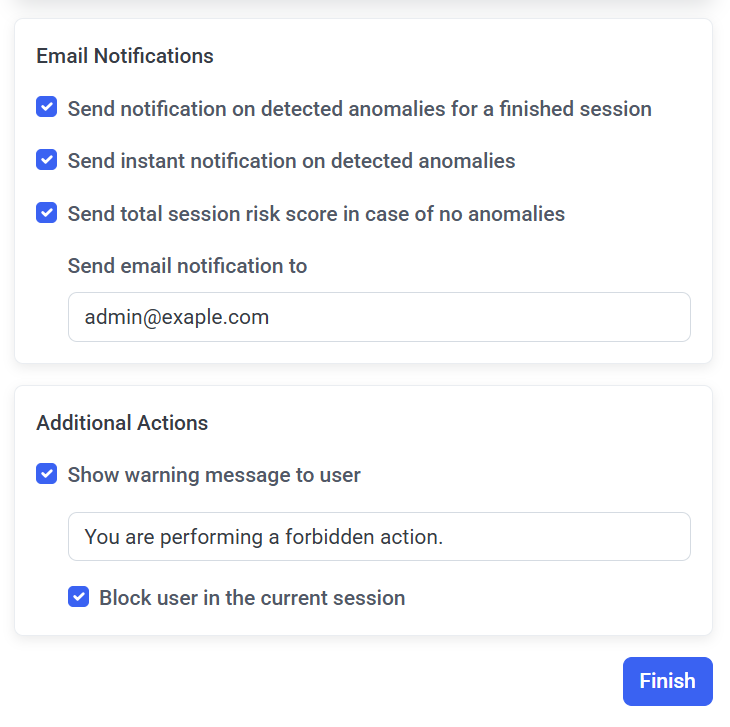 • Select the Send notification on detected anomalies for a finished session checkbox if you want to be notified about anomalies in users’ behavior when a session finishes.