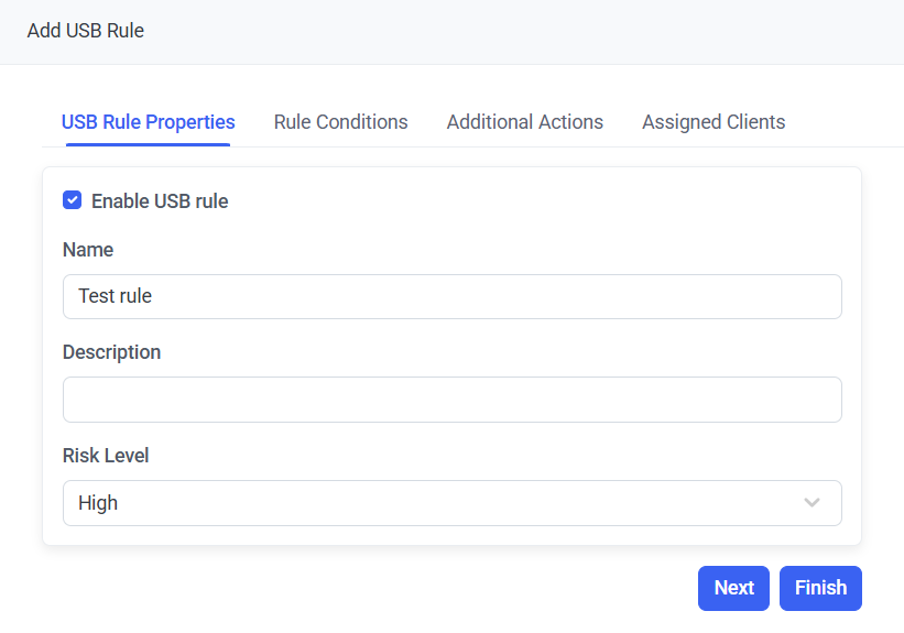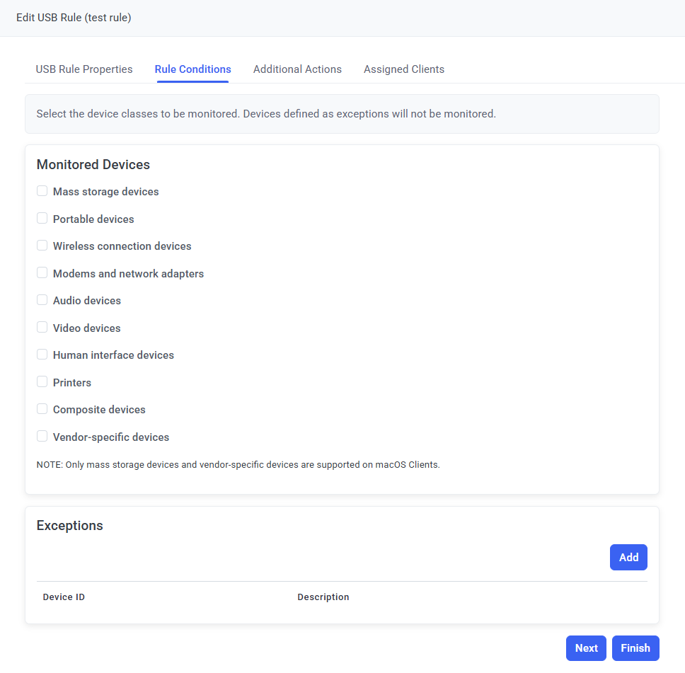NOTE: If the USB monitoring rule is created while the device is connected to the Client computer, device blocking will not work. For the rule to work, the device first needs to be unplugged and then plugged in again.