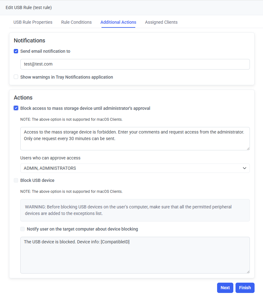 - Block access to mass storage device until administrator's approval: Allows you to prevent the use of the USB devices until the specified Approver grants access to it. Users specified as Approvers can approve the USB device access request in one of the following ways: by email (if an email address is defined for the specified users) or on the Access Requests page of the Management Tool.