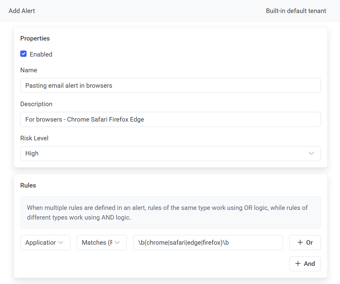 6. If required, add additional alert rules by clicking the “+ Or” and “+ And” buttons to work in combination with each other using OR/AND logic.