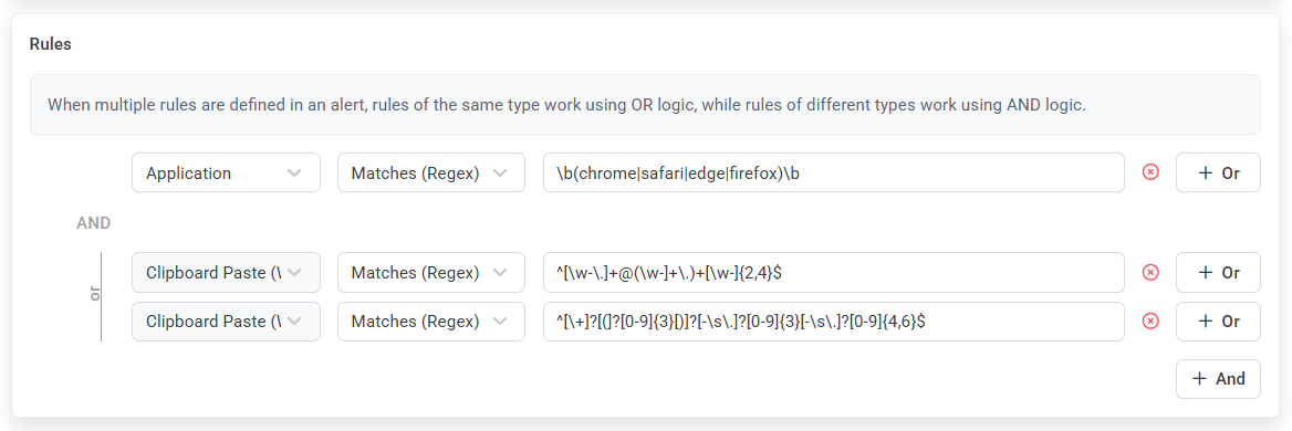 The screenshot above shows an example of using a combination of rules with regular expressions to detect (i.e. trigger the alert on) both: