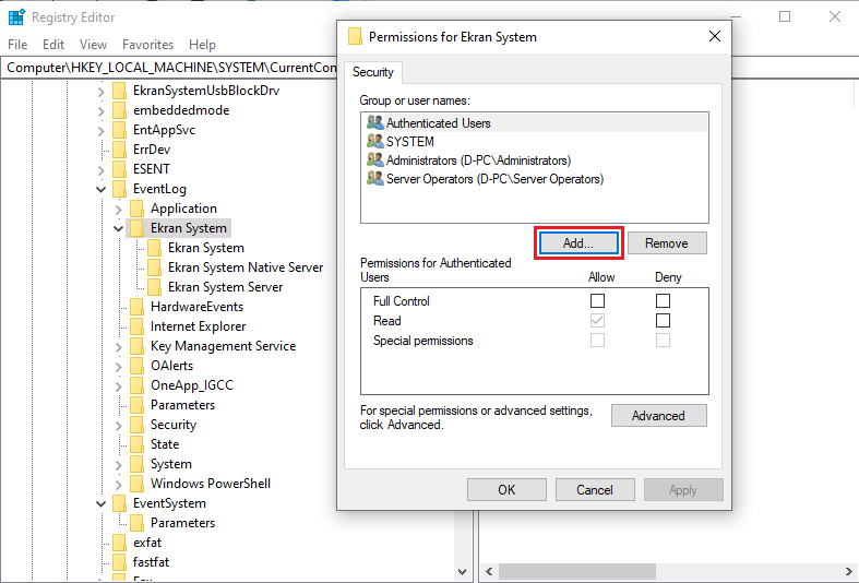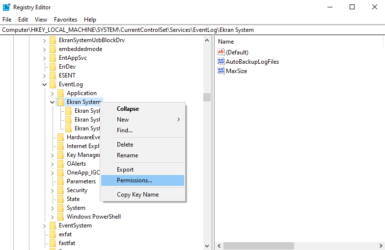 - Navigate to the HKEY_LOCAL_MACHINE\SYSTEM\CurrentControlSet\Services\EventLog\Ekran System registry key, right-click on it, and select Permissions.