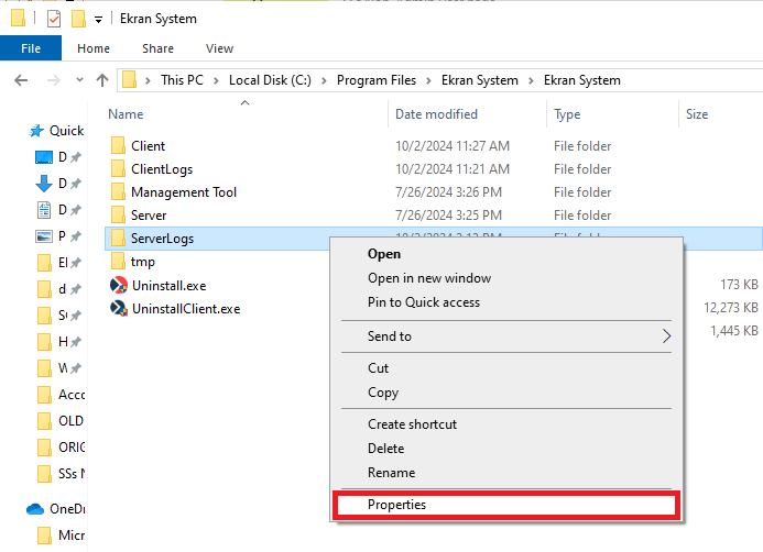 - Navigate to the C:\Program Files\Ekran System\Ekran System\ServerLogs directory, then right-click on it, and select Properties.