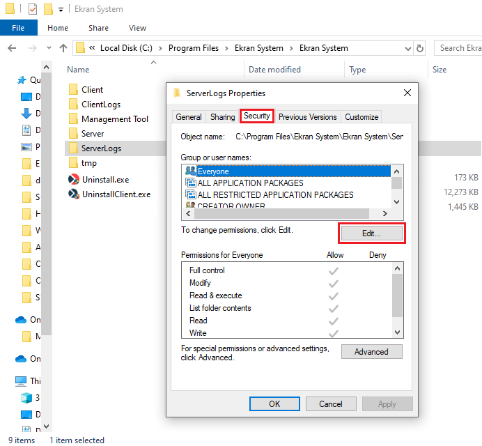- In the ServerLogs Properties pop-up window that opens, select the Security tab, and then click the Edit button.