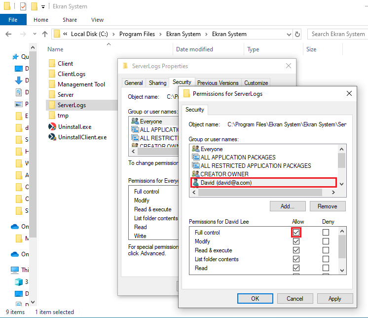 b) In a similar way as above (see 9a), to prevent certain errors related to file access: Allow the non-admin user the Full control permission for the C:\Program Files\Ekran System\Ekran System\Server directory.