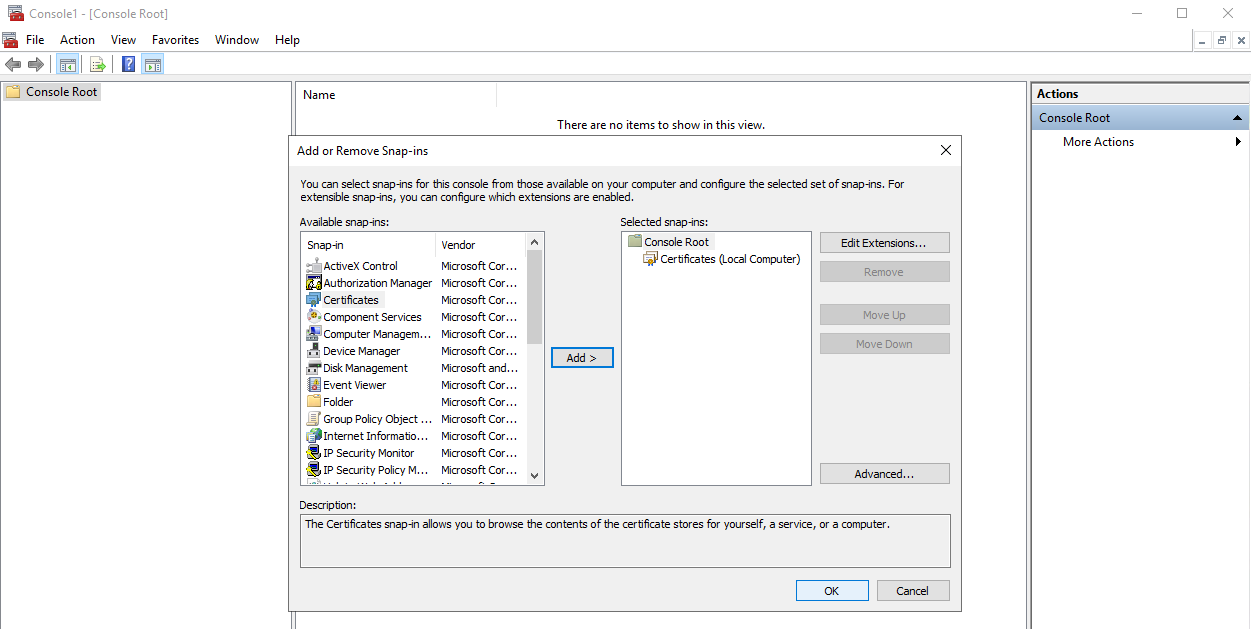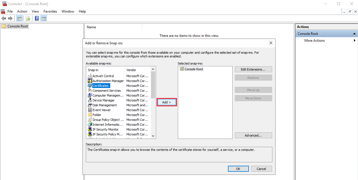 3. In the Add or Remove Snap-ins window that opens, select Certificates, and then click the Add button.
