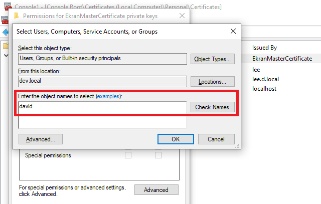 • In the Select Users, Computers, Service Accounts, or Groups pop-up window that opens, in the Enter the object names to select field, search for the required user (i.e. the non-admin user that you want to allow to start the EkranServer service) by entering the username (or part of the username), and then click the Check Names button, add the required user, and click OK in all the pop-up windows.