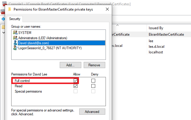 14. In the Permissions for EkranMasterCertificate private keys window that opens, select the user that you added, and then select the checkbox to allow the Full control permission for them (and the Read permission will also be automatically applied), and then click the OK (or Apply) button to save the changes.