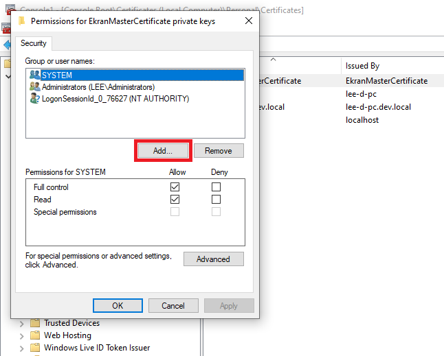 11. In the Permissions for EkranMasterCertificate private keys window that opens, click the Add button.
