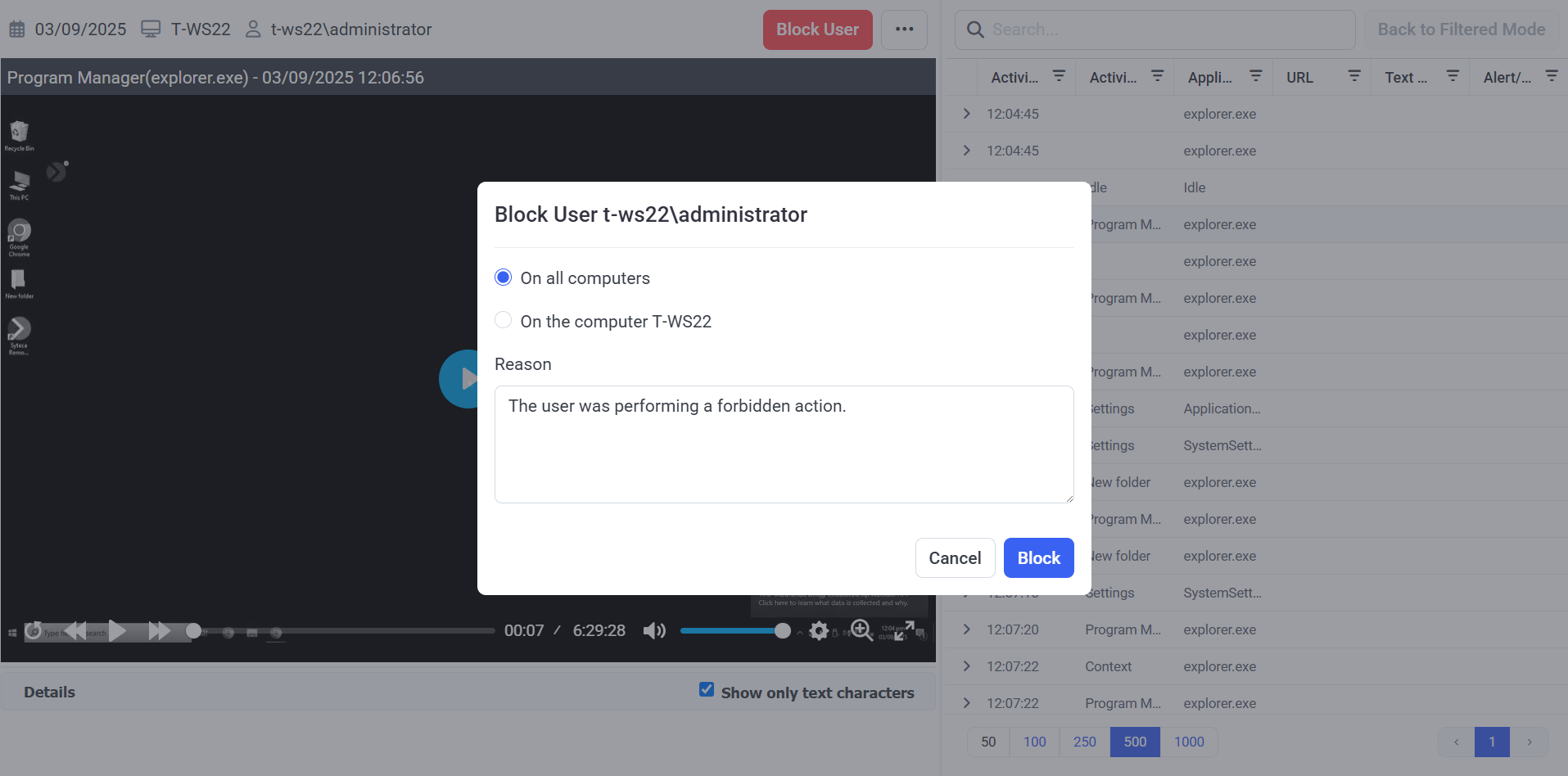 NOTE: If you selected to block the user on all computers, they will be logged out of all computers which they are logged in to, at the time of blocking.