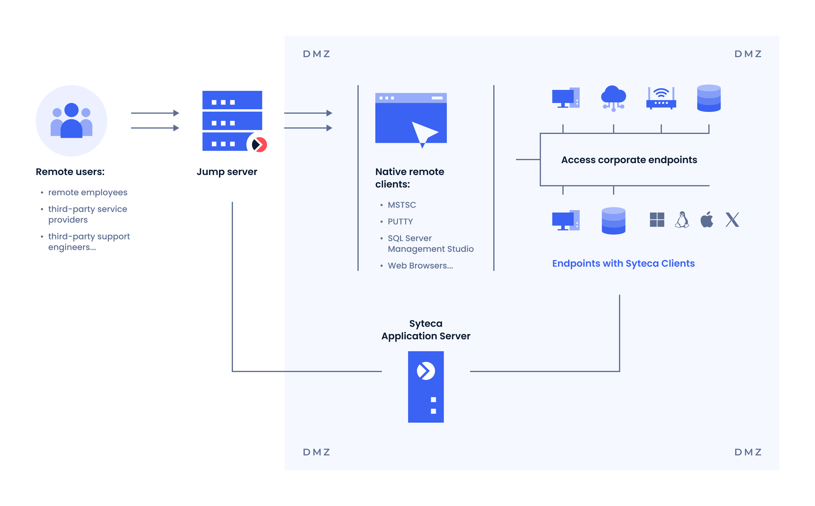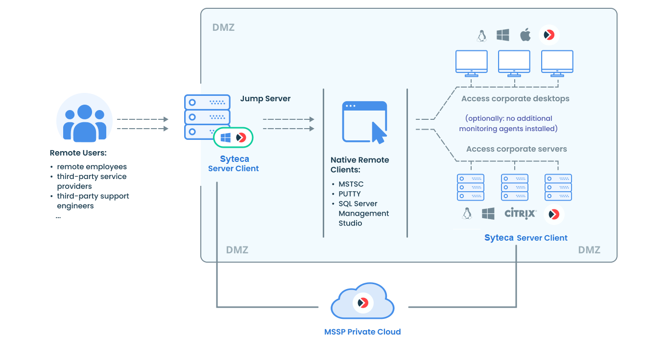 You can install just one Syteca terminal server Client on a jump server to monitor all the sessions that come through it concurrently and, if needed, manage access to endpoints within the protected perimeter using Syteca's PAM toolset.