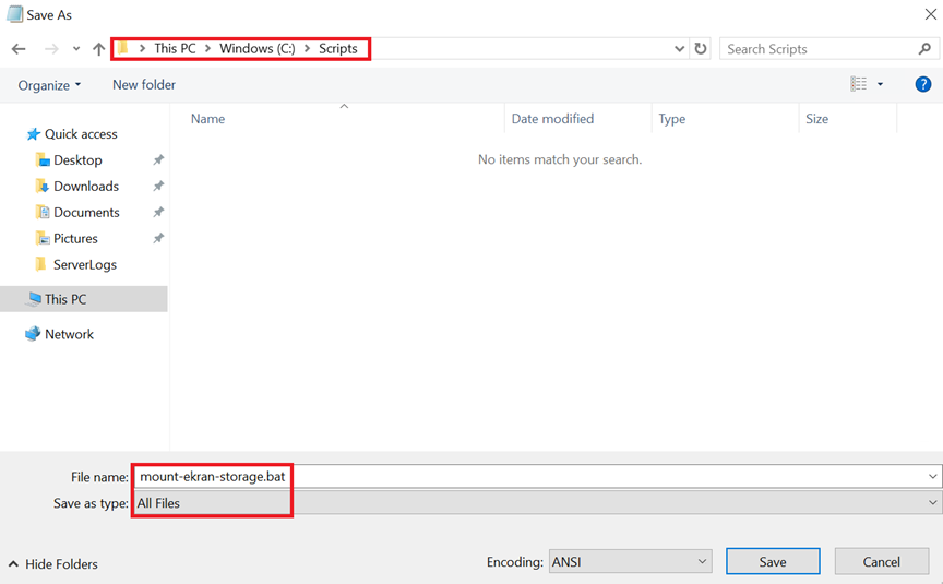 3. In the File menu of the Notepad application, select Save As, and in the window that opens, do the following: