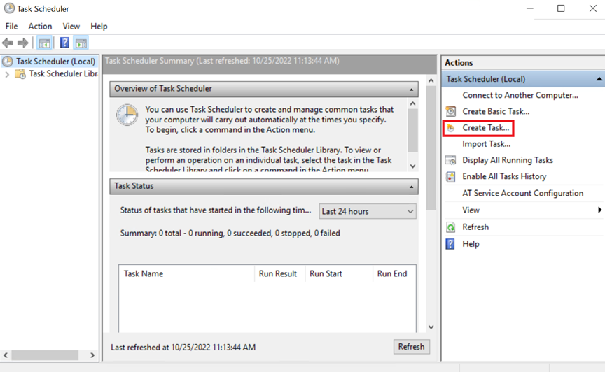 18. In the Task Scheduler window, select Task Scheduler Library in the pane on the left, and find the task created in the list, and then right click on it, and select Run.
