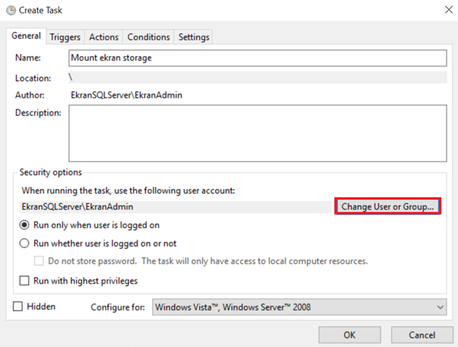 11. Click OK to go back to the Create Task window, and on the General tab, check that the selected user account is displayed in the Security options section.