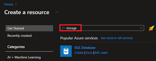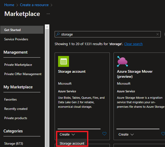 4. Find the Storage account service, and then click Create, and select Storage account.