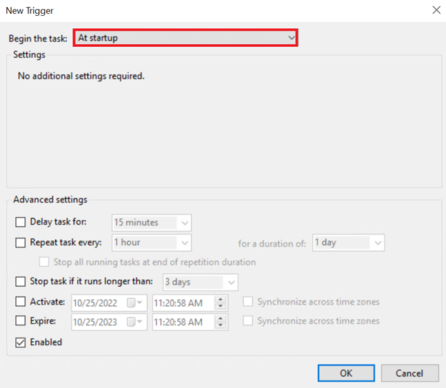 13. In the New Trigger window that opens, select At startup in the Begin the task drop-down menu.