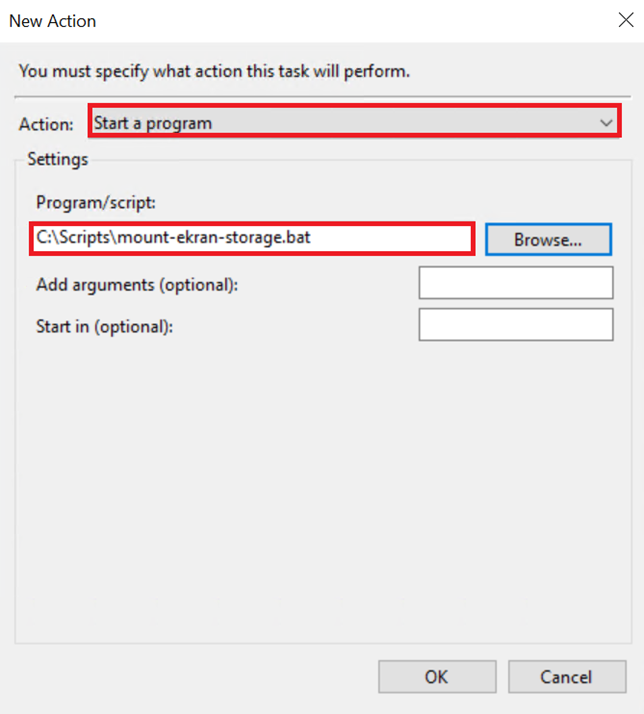 16. In the New Action window that opens, in the Action drop-down menu, select Start a program, and then in the Program/script field, enter the path to the mounting script (or use the Browse button to find it in File Explorer).