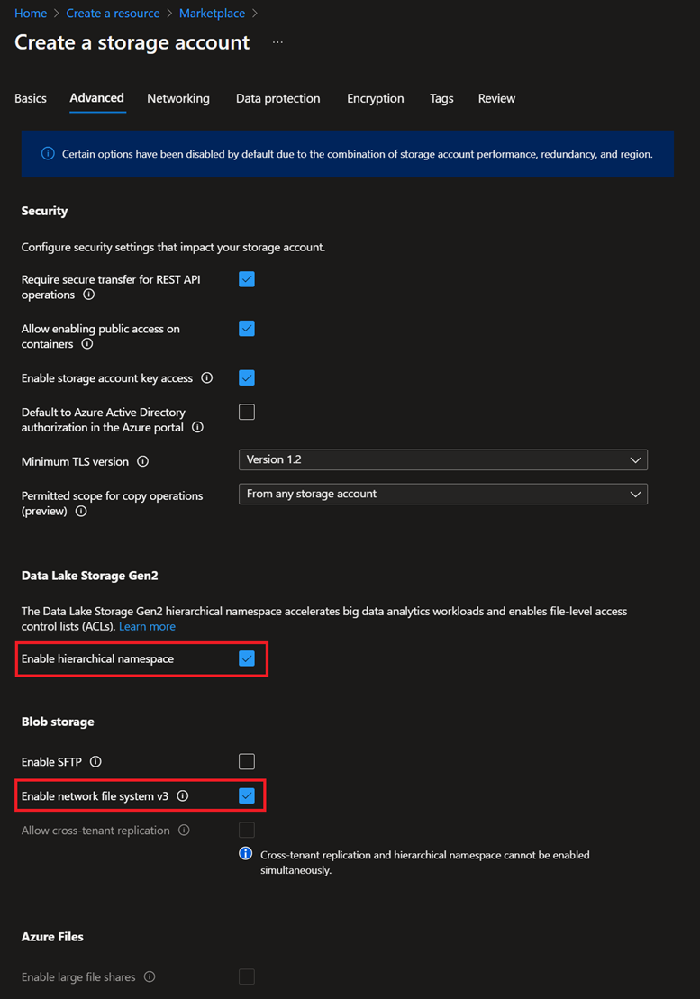 1. Creating an Azure Storage Account by Using the NFS 3.0 Protocol and Hierarchical Namespace Support