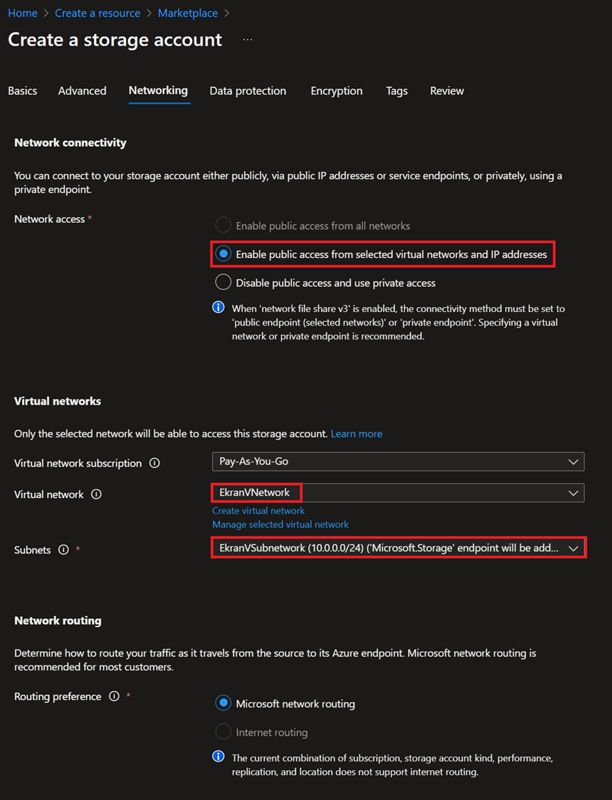 9. On the Networking page, make sure the Enable public access from selected virtual networks and IP addresses option is selected, and in the Virtual networks section, select the same virtual network that Syteca was deployed on.