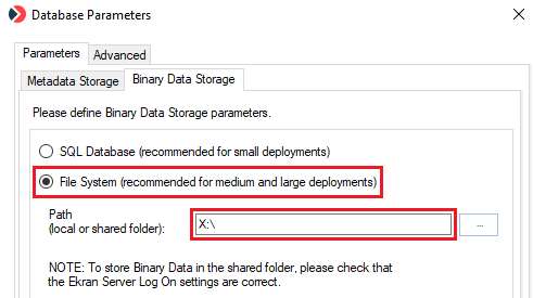 4. Select the File System option, and specify the Path to the connected storage location to be used for the binary data.