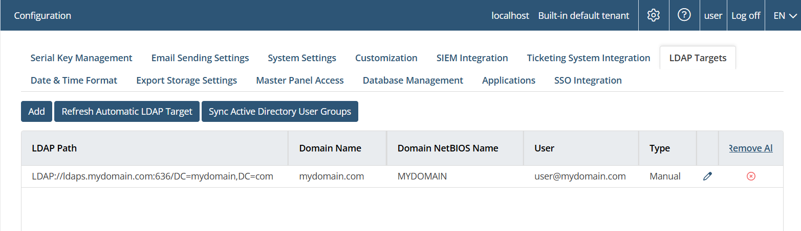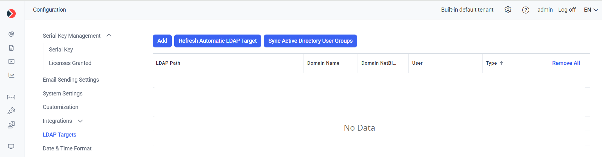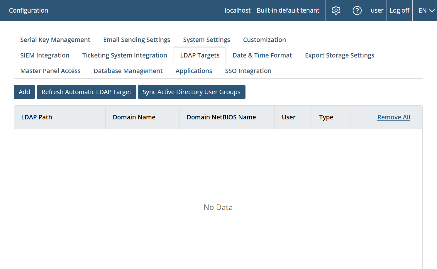 6.1. Log in to the Syteca Management Tool as a user in the default Administrators user group, and click the Configuration () button (at the top), and then on the Configuration page that opens, select the LDAP Targets tab.