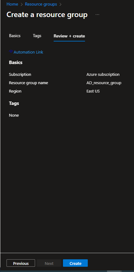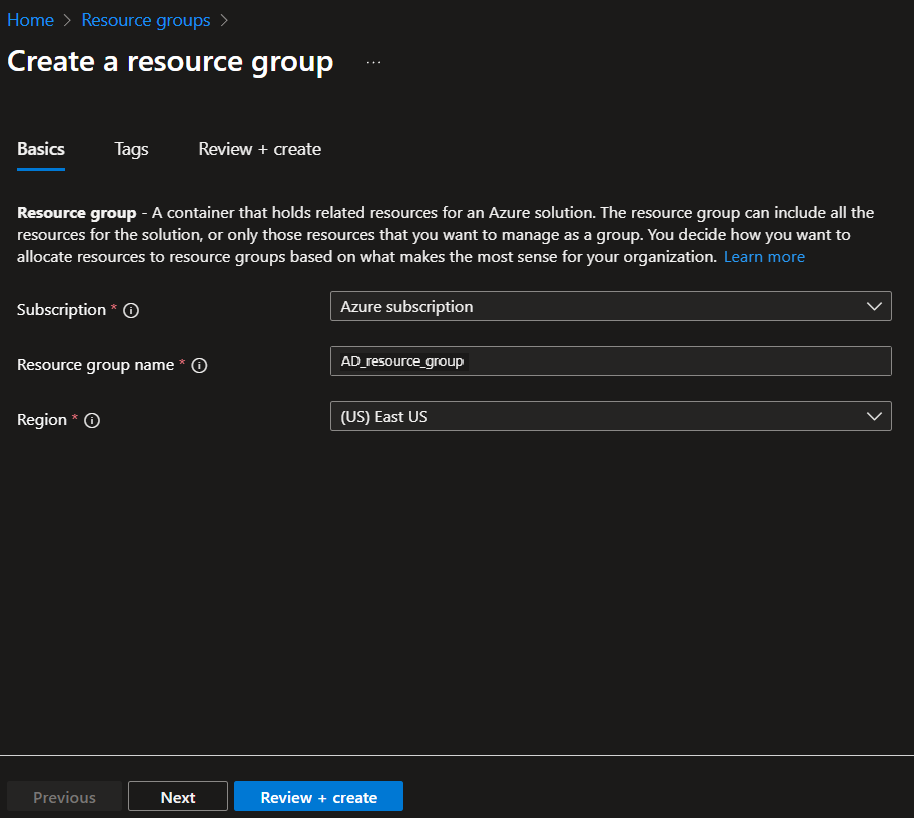 1.4. Select the Subscription required, enter a Resource group name (e.g. "AD_resource_group" is used in the screenshot below), and select the Region required, and then click the Review + create button (at the bottom).