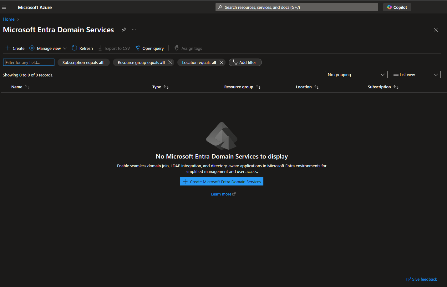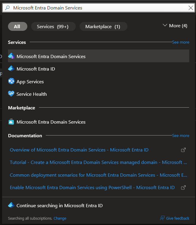 2.1. Search for, and click Microsoft Entra Domain Services to open it.