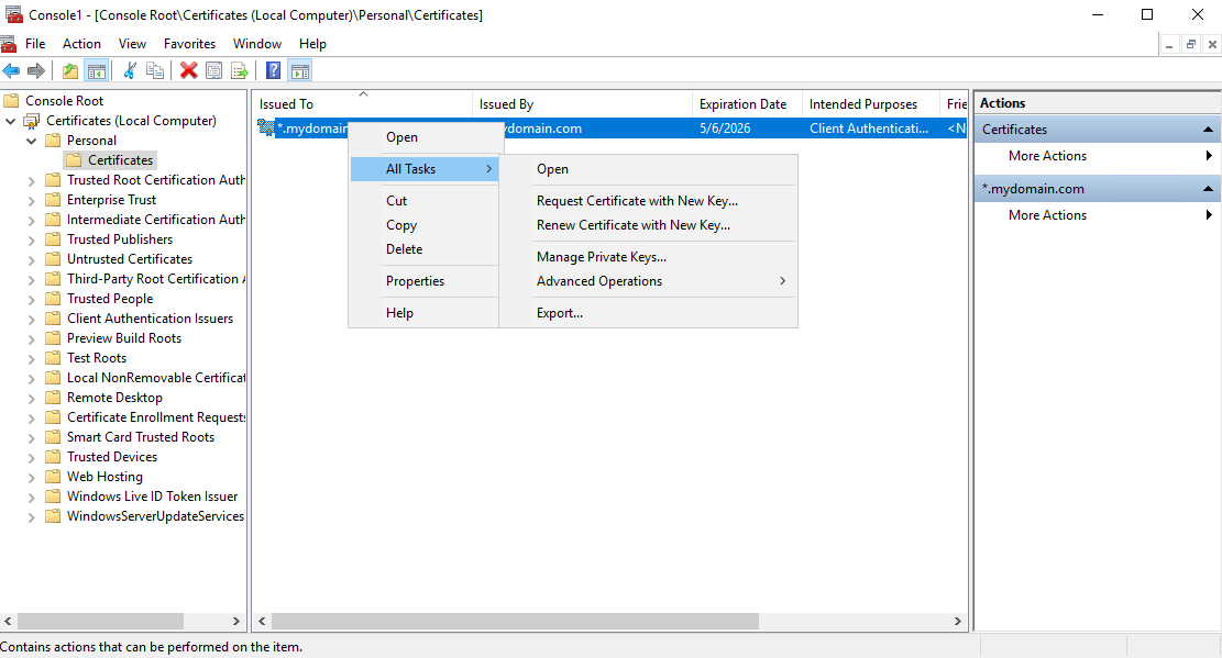 4.3.1. Back in the Certificates (Local Computer) > Personal > Certificates folder in mmc, right-click on the self-signed domain certificate, and select All Tasks > Export…