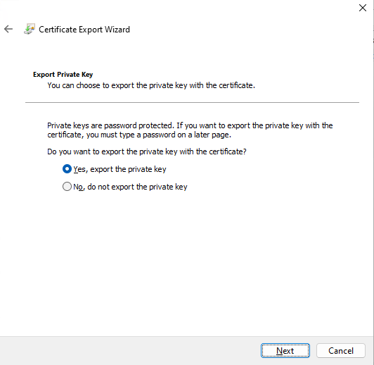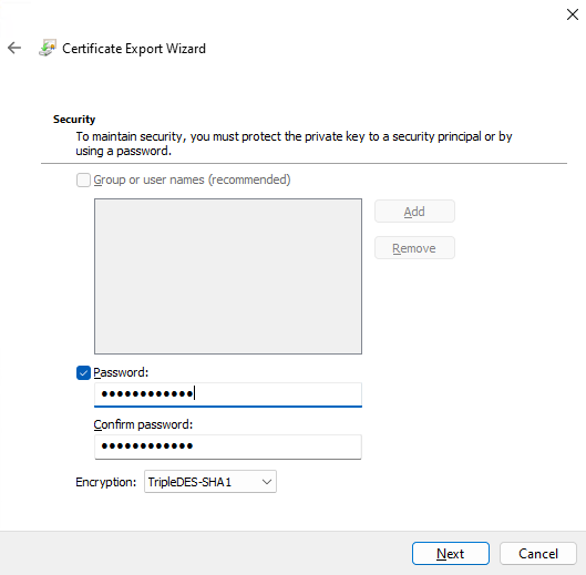 4.2.11. Enter a Password for the certificate (and enter it again in the Confirm password field), and then click Next.