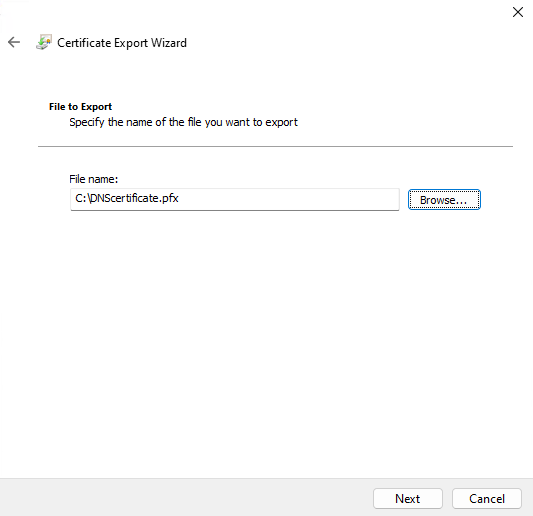 4.2.12. Click Browse..., and select the folder to export the PFX certificate to, and then click Next.