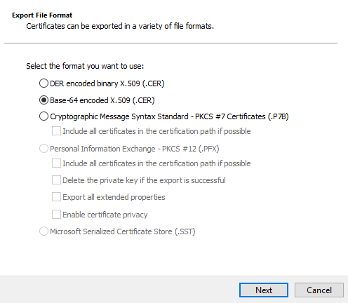 4.3.4. Select Base-64 encoded X.509 (.CER), and click Next.