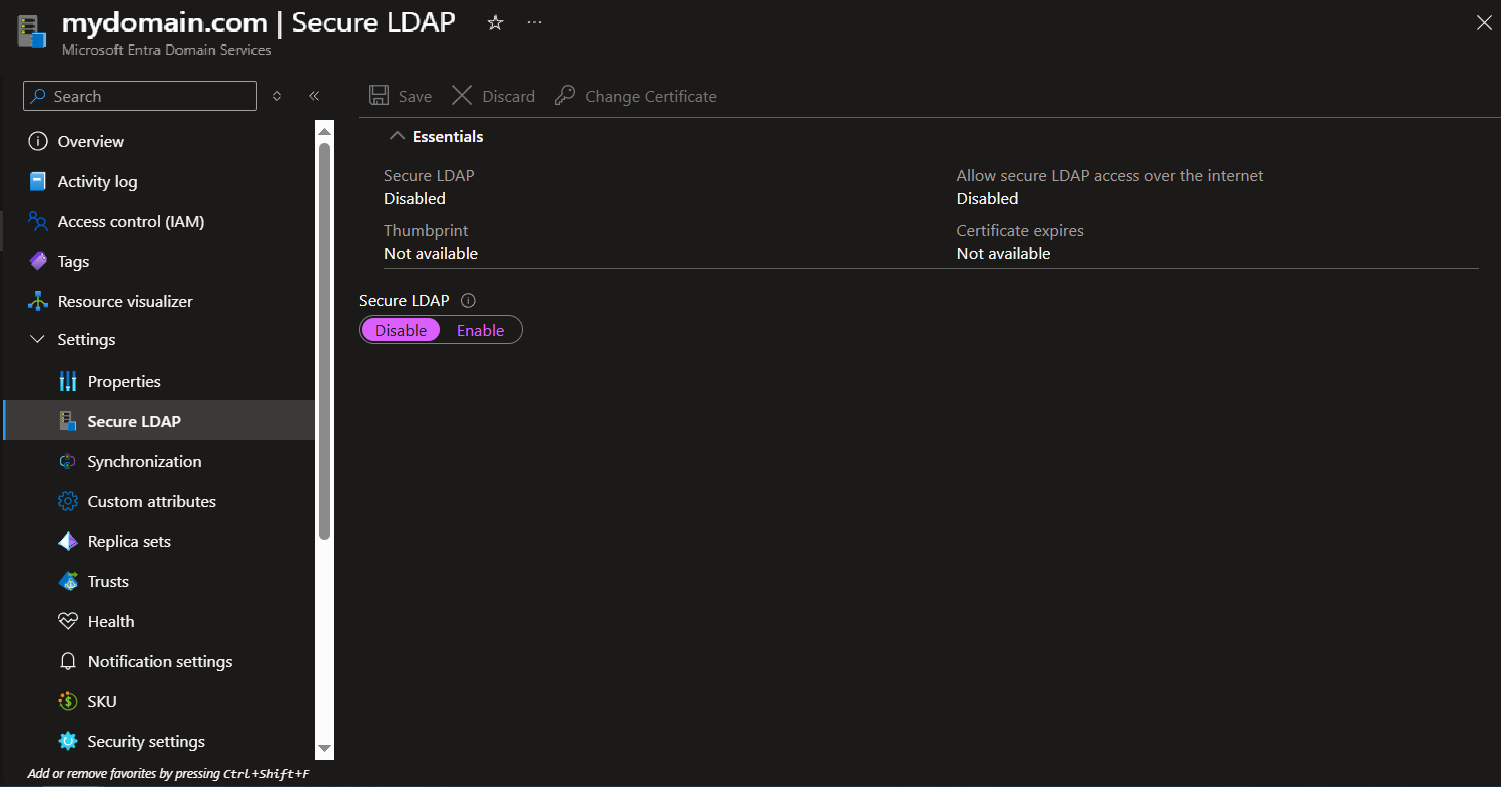 4.4.2 Select Settings (in the menu on the left), and select Secure LDAP, and then click Enable to enable the Secure LDAP.