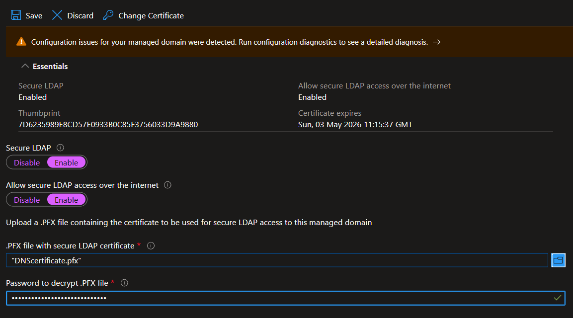 4.4.3. Click Enable to enable Allow secure LDAP access over the internet, and upload the PFX certificate (exported in Point 4.2 above), and then enter the Password to decrypt .PFX file, and click Save (in the top left).