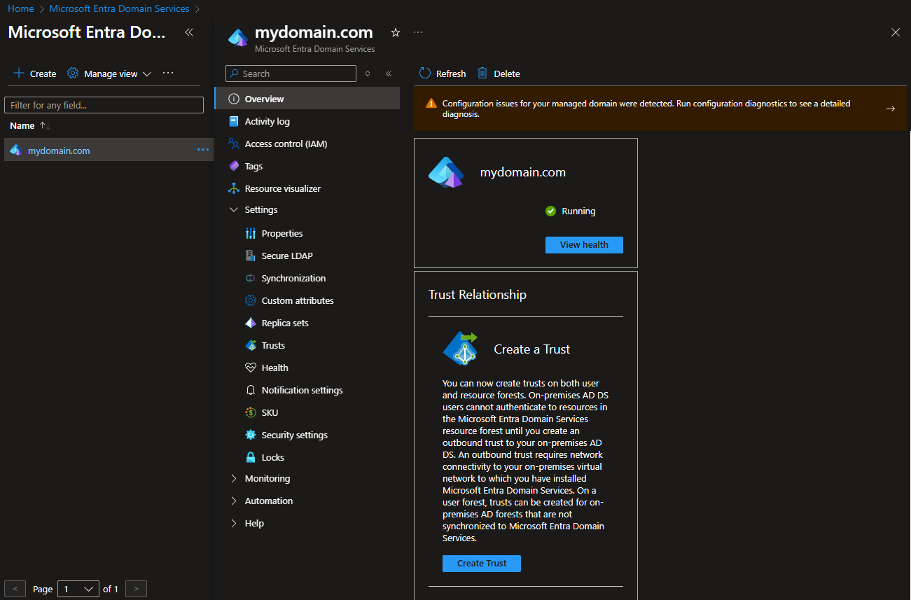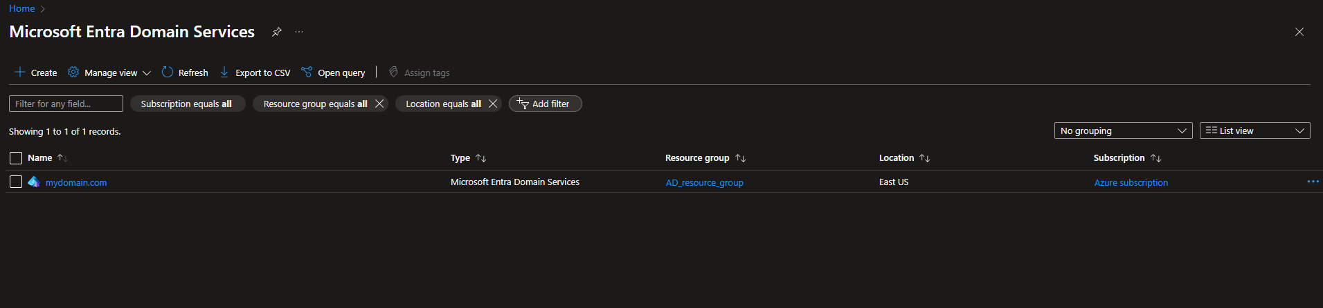 4.4.1. Open Microsoft Entra Domain Services, and click on the domain in the Name column (created in Section 2 above).