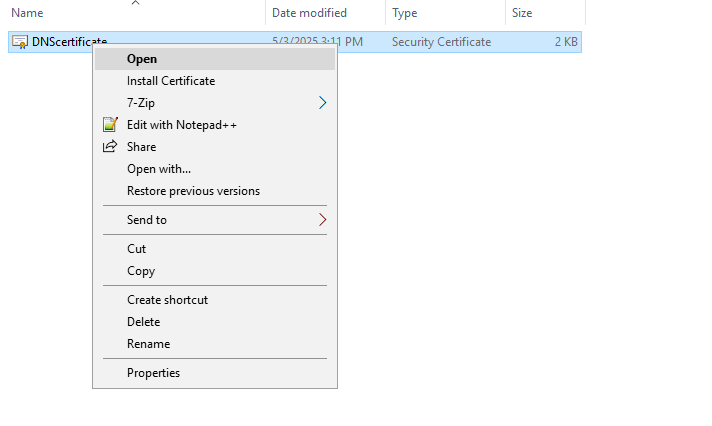 4.5.1. Copy the CER certificate to the computer where Syteca Application Server is installed, and right-click on it, and select Install Certificate.