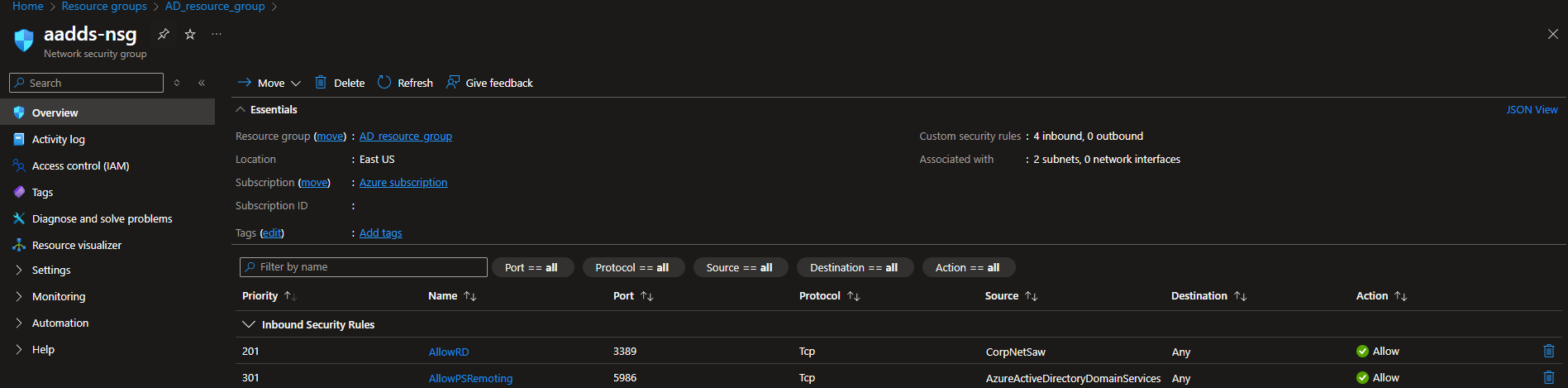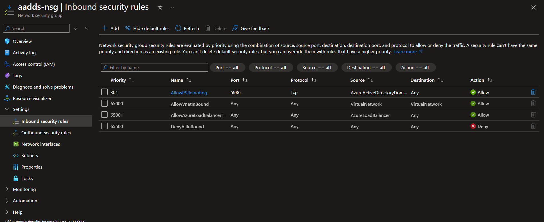 4.7.2. Click on the required resource of the Network security group type in the Name column (e.g. the default "aadds-nsg" group is used in the screenshot below) to open it.