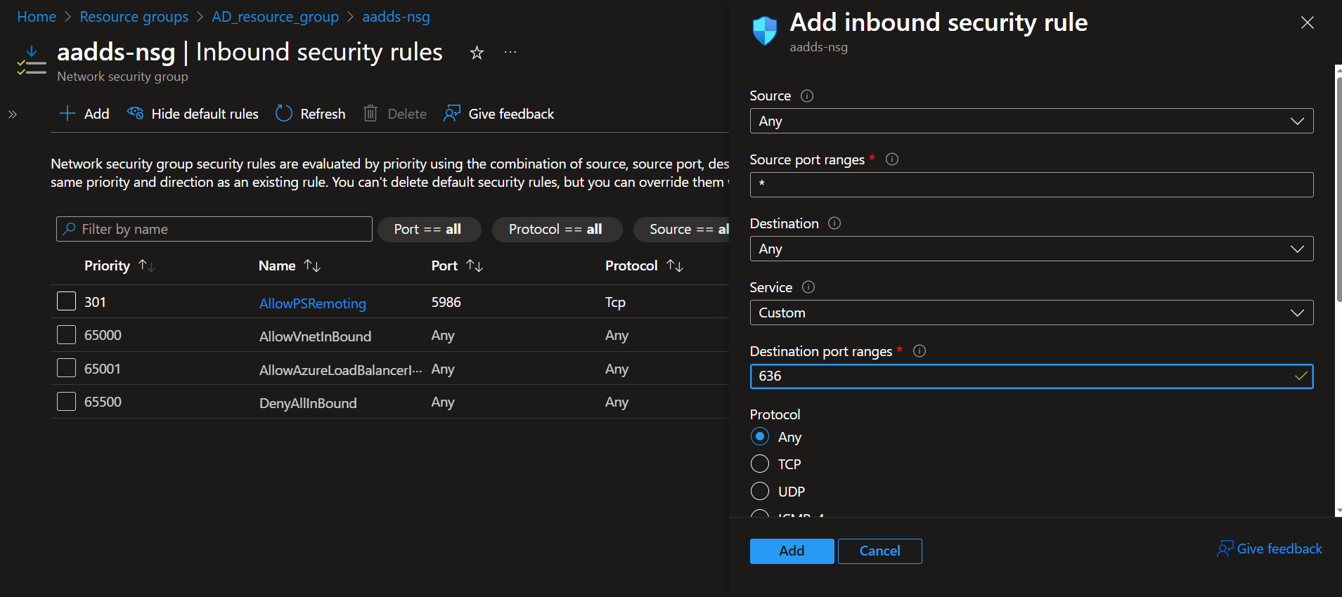 4.7.5. In the new rule, enter the value "636" in the Destination port ranges field, and then click the Add button (at the bottom).
