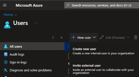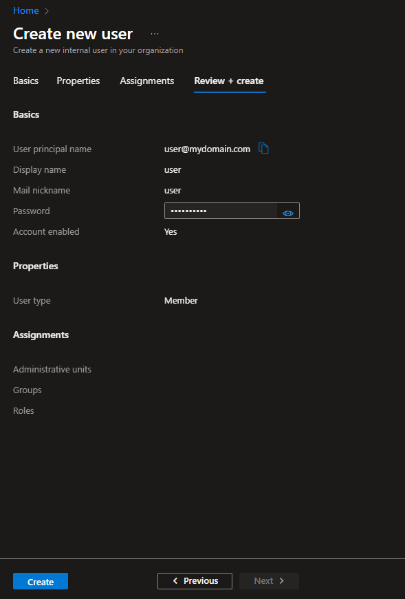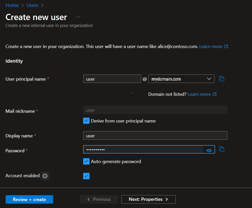 5.3. Enter a User principal name (and select the Domain), a Display name, and a Password (or select Autogenerate password), and then click the Review + create button (in the bottom left).