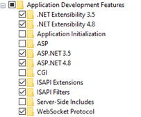 Windows 10 | Make sure that all the following checkboxes are selected in the Windows Features window, and then click OK: • .NET Framework 4.8 Advanced Services • Internet Information Services > Web Management Tools > IIS Management Console • Internet Information Services > World Wide Web Services > Application Development Features > ASP.NET 4.8, and WebSocket Protocol • Internet Information Services > World Wide Web Services > Common HTTP Features > Static Content |